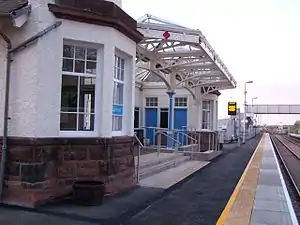 Laurencekirk railway station is a railway station serving the communities of Laurencekirk and The Mearns in Aberdeenshire, Scotland. The station was reopened on 18 May 2009 at a cost of £3 million.[4] It is sited 210 miles 44 chains (338.8 km) from Carlisle, and is between Montrose and Stonehaven, on the Dundee to Aberdeen line. There is a crossover at the north end of the station, which can be used to facilitate trains turning back if the line south to Montrose is blocked.[5]