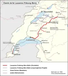 The aim of the LFB was to connect the French-speaking part of western Switzerland with the German-speaking part of central Switzerland with a line from Lausanne to Bern via Oron and Fribourg. The line now forms part of the Lausanne–Bern railway, now owned by the Swiss Federal Railways.