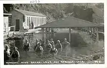 The springs were historically used by local Bannock and Shoshone Native Americans.[1] In the early 1800s, explorers and fur trappers knew of the hot springs, and Robert Dempsey built a permanent camp nearby. During the 1840s and 50s, travellers headed to California and Oregon were aware of the springs. In 1890, John and Mary Hall, English immigrants homesteaded the site. In 1902, the Shoshone and Bannock peoples ceded the hot springs site and surrounding acreage to the U.S. government.[2]