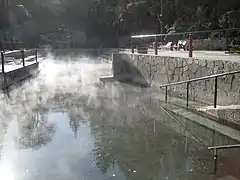 The spring system has a flow of 34 gallons/second / 130 liters/second. The hot mineral water emerges from the ground at 113°F / 45°C.[5] The mineral content of the water includes manganese, sodium, iron, calcium bicarbonate, potassium, magnesium, iron, zinc and fluoride.