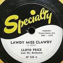 "Lawdy Miss Clawdy" is a song by New Orleans singer-songwriter Lloyd Price that "grandly introduced The New Orleans Sound".[1] It was first recorded by Price in 1952 with Fats Domino and Dave Bartholomew during his first session for Art Rupe and Specialty Records. The song became one of the biggest selling R&B records of 1952 and crossed over to other audiences. "Lawdy Miss Clawdy" inspired many songs and has been recorded by a variety of artists.