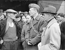 ![]() Air Marshal L A Pattinson, Air Officer Commanding-in-Chief Flying Training Command, talking to workers at Rugby, Warwickshire, on the completion of an RAF training station in the Midlands | |