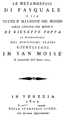 Le metamorfosi di Pasquale, o sia Tutto è illusione nel mondo is a one-act farsa opera by Gaspare Spontini on a libretto by Giuseppe Foppa, which premiered at the Teatro San Moisè, Venice in 1802. The opera was Spontini's last work for Italy before his move to Paris and then Berlin. The opera was considered lost but rediscovered in the collection of the Duke of Ursel in Belgium in 2016.[1]