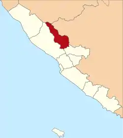 Lebong is an inland regency of Bengkulu Province, Indonesia, on the island of Sumatra. It covers an area of 1,665.28 km2, and had a population of 97,091 at the 2010 Census[3] and 106,293 at the 2020 Census;[4] the official estimate as at mid 2022 was 107,248.[2] Contrary to the popularly-held belief that the town of Muara Aman is the seat of the government of Lebong Regency, the regency's capital is actually located in neighboring Tubei district (previously known as Pelabai), where all the office and judiciary institution is situated. Until 1966 the regency, together with the rest of what is now Bengkulu Province, was part of South Sumatra Province.[5] It formed part of Rejang Lebong Regency until 25 February 2003, when the northwestern districts of that regency were split off to create the new Lebong Regency.