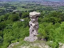Near the top of Leckhampton Hill stands a noted limestone rock formation known as the Devil's Chimney. It is believed that the chimney was created by limestone quarrymen.