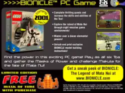 Prior to its cancellation, The Legend of Mata Nui was heavily promoted by Lego.[3][4] Ben Sledge of IGN described its contemporary promotional campaign as "surprisingly extensive at the time for a game that never came out".[1] Boxes of Cheerios cereal were packaged with a CD-ROM disc that contained a cutscene from the game, and its upcoming release was frequently mentioned in the Bionicle comics series as well as the Bionicle website. Lego also planned to include an exclusive mask (the Kanohi Vahi, the mask of time) with copies of the game.[4] A public call for beta testers was put out by Lego,[11] although these beta tests never took place due to the game's cancellation.[4]