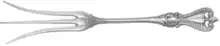 The lemon fork is a small (4+ inches long[1]) serving utensil that is used to move lemon slices.[2][3] Lemon forks have three long tines, with the outside tines splayed;[4] ostensibly this arrangement helps to release more juice.[1] Lemon forks became popular in the last quarter of the 19th century alongside other specialized utensils, such as asparagus tongs.[5] One early 20th century cookbook called the lemon fork a "necessity" at the five-o-clock tea party.[6] At table settings, the fork was placed over the slice of lemon.[7] Unlike many specialized utensils, lemon forks are still used in the 21st century, primarily in the restaurants.[5]
