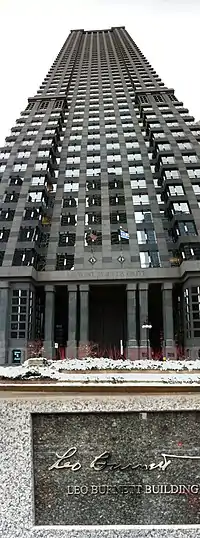 The Leo Burnett Building, located on 35 West Wacker Drive at North Dearborn Street in the Chicago Loop, is a 50-story, 635 foot (193 m) tall skyscraper above the Chicago River's Main Stem on the southern bank. When built in 1989, it was the 12th tallest structure in Chicago.[1] It was designed by Kevin Roche-John Dinkeloo and Associates and Shaw & Associates. It is a postmodern design made with granite, masonry, glass, steel and concrete. The windows are divided by stainless steel bars, which is typical of "Chicago windows."[2]