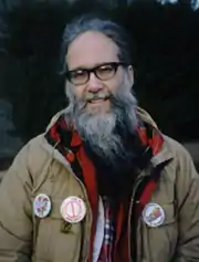 Len Tower wearing League for Programming Freedom and "No Smoking" badges (c. 1996)