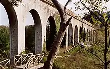 The aqueduct crosses valleys in the Livorno Hills, supported on great arches which tower above the forests and slopes of macchie below.