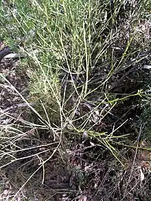 Leptomeria acida, known as acid drops or sour currant-bush, is an apparently leafless parasitic shrub, found on the coast and ranges in eastern Australia. The habitat is dry eucalyptus woodland, often in sheltered sites. This plant is a root parasite. Branchlets are stiff, angular and spreading. Red flowers form in summer on racemes, 15 to 20 mm long. The fruit is a green or reddish drupe, sometimes tinged with purple. Leaves are tiny, 1 to 2 mm long, though barely noticeable.