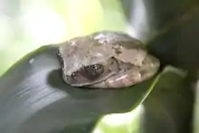 Adult males measure 44–50 mm (1.7–2.0 in) and females 60–70 mm (2.4–2.8 in) in snout–vent length. The dorsum is either uniform green with white heels, or brown with a darker, forward-pointing triangle with a blunt apex. There is a dark bar between the eyes and a dark canthal line. Young, green specimens often have yellow spots.[5]