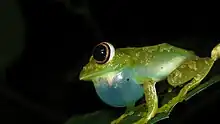 Adult L. grandiceps are slender with pointed snouts and large heads. The tympanum is distinctly small, spanning 1⁄3-2⁄5 of the horizontal diameter of the eye.[2] The toes are 1⁄2 webbed ending with large disks in both the manual and pedal digits. The inner metatarsal tubercles are small ovoid and non prominent.[2] Subarticular tubercles are somewhat prominent.[2] Their skin is a bright translucent green with light coloured patches on the frog's lower jaw.[2] They occasionally have light coloured small dots on their skin as well. Males are considered small (30-33mm) while females medium (39-45). The heads are wider than they are long and contain large protruding eyes.[2] Eyes are light coloured with orange patches and black vermiculation.[2]