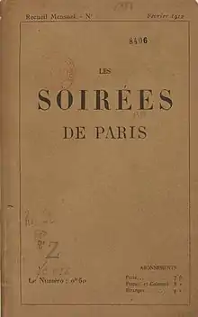 Les Soirées de Paris was a French literary and artistic review founded in February 1912 by Guillaume Apollinaire and four of his associates - André Billy, René Dalize, André Salmon, and André Tudesq. It was last published in August 1914.[1]