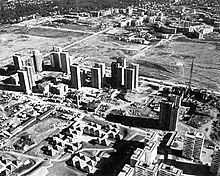 The town was conceived and built in the 1970s according to the precepts of Le Corbusier by architects Robert Camelot, François Prieur and Georges-Henri Pingusson. Its tower blocks are raised on slabs so that they are accessed above street level by means of pedestrian walkways. The town incorporates a large urban park, to the north.