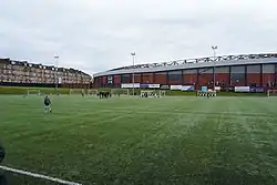 Lesser Hampden is tightly hemmed in to the west by surrounding housing and commercial developments. It has some areas of terracing, floodlights and a small covered grandstand adjacent to the original farmhouse building. The natural grass pitch was replaced with a 3rd-Generation astro-grass pitch (funded partly by donations from local businessman Willie Haughey and partly from proceeds from well-attended cup ties)[11] and was used as a warm-up area for athletes competing in the 2014 Commonwealth Games, as the track and field events were held at Hampden Park.[12] Like the main stadium it was temporarily converted into an athletics venue and thereafter returned to football use.[6][13]