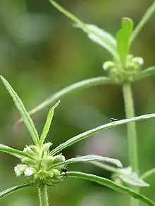 - Verticillaster, flowers white, small, and directly attached to the base without a peduncle or stalk. The flowers are held together in auxiliary whorls or dense terminals. They contain 6 mm long bracts equaling the calyx[4] that are bristle-tipped, linear, acute and are "ciliate with long slender hairs".[2]