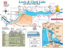 Lewis and Clark Lake is a 31,400 acre (130 km²) reservoir located on the border of the U.S. states of Nebraska and South Dakota on the Missouri River. The lake is approximately 25 miles (40 km) in length with over 90 miles (140 km) of shoreline and a maximum water depth of 45 feet (14 m).[2] The lake is impounded by Gavins Point Dam and is managed by the U.S. Army Corps of Engineers, Omaha District.