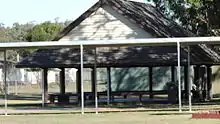 "Playshed" is the name used officially as well as colloquially for these structures. They were commonly associated with early lowset schools and were superseded by the innovation of raising the school buildings on high stumps to provide shelter underneath. More recently however shade structures within the school playground have enjoyed a renaissance. Playsheds were not designed to facilitate any particular game (although the board for the game of "Stones and Glasses" has been engraved on two of benches in the playshed) but rather were more general purpose spaces. In Queensland they were a response to the climate as well as a mechanism for dealing with a fluctuating number of enrolments.[1]