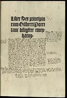 The Liber sex principiorum (or Liber de sex principiis) is an anonymous Latin work of philosophy from the late twelfth century. It aims to complement Aristotle's Categories by providing justifications for the six categories neglected by Aristotle in his scheme of ten categories.[1] The "six principles" (categories) of the title are place, time, position, possession, action and passion (on top of substance, quality, quantity and relation).[2] The Liber became one of the standard works of the logica vetus ('old logic') curriculum and by the mid-thirteenth century was erroneously ascribed to Gilbert de la Porrée. It was widely commented upon by medieval philosophers, including Robert Kilwardby, Nicholas of Paris, Martin of Dacia, Radulphus Brito, Peter of Auvergne and Thomas of Erfurt.[1] Nevertheless, the complete text does not survive, only fragments.[2]