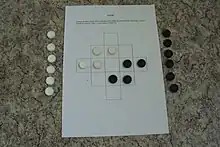 A 13 space slanted or diagonal square board is used. Each player has 10 pieces each. One plays the black pieces, and the other plays the white pieces.