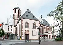 In 1344 the chapel was expanded to a Gothic hall church of three naves.[2] A document about its consecration mentions two altars. From 1415, the south facade was transformed, including a tympanum showing the Adoration of the Magi made by the workshop of Madern Gerthener.[3][4] In 1453 the town council permitted to change an adjacent tower of the fortification to a bell tower. From 1506 to 1509 the church was once more expanded, by Jörg Östereicher.[3] The church remained Catholic, part of the Diocese of Mainz, even when the Reformation was introduced in Frankfurt in 1533.[1]