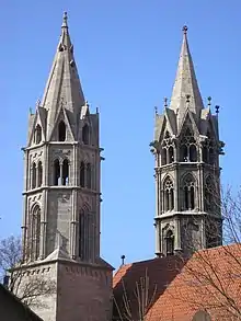 In the second quarter of the 13th century, parts of the side aisles, the clerestory, the vaults of the central nave[4] and the portals in the west and in the side aisles were built. Due to its characteristic building forms, this building phase is counted among the group of buildings that were created in stylistic dependence on the Cistercian monastery of Maulbronn and are often referred to in research as "Maulbronn School buildings". A designation which, as Ernst Badstübner writes, "is not entirely appropriate for the buildings in Thuringia", "because on the one hand the dependence on the Black Forest monastery is not a direct one, and on the other hand because far more elements than can be explained by an influence from Cistercian architecture determine their character."[5] The two polygonal decorative towers on the west rail, which statically did not harmonise optimally with the older substructure and are unsuitable to accommodate mighty bells, belong to this construction phase, too. Their stylistic similarity to the church buildings in Mühlhausen, especially those of St Mary's and Divi Blasii, was noticed early on. The stylistic development from the Late Romanesque south tower to the Gothic north tower in the middle of the 13th century can be seen in Arnstadt as a model for Thuringia.
