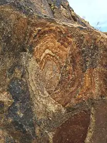 Liesegang rings (/ˈliːzəɡɑːŋ/) (also called Liesegangen rings or Liesegang bands) are colored bands of cement observed in sedimentary rocks that typically cut across bedding.[1][2] These secondary (diagenetic) sedimentary structures exhibit bands of (authigenic) minerals that are arranged in a regular repeating pattern.[3] Liesegang rings are distinguishable from other sedimentary structures by their concentric or ring-like appearance. The precise mechanism from which Liesegang rings form is not entirely known and is still under research,[4] but there is a precipitation process that is thought to be the catalyst for Liesegang ring formation, referred to as the Ostwald-Liesegang supersaturation-nucleation-depletion cycle.[5] Though Liesegang rings are considered a frequent occurrence in sedimentary rocks,[6] rings composed of iron oxide can also occur in permeable igneous and metamorphic rocks that have been chemically weathered.[7]