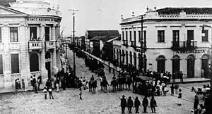 On the orders of colonel Enéas, white flags were raised at the headquarters and an emissary was sent to major Barão.[50] At 09:00 the Military Brigade launched a general advance.[45] The only resistance encountered was in Vila Brasil.[lower-alpha 3] The population took to the streets, and the 1st RC occupied the army barracks.[50]