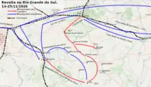 The plan consisted of a four-column invasion across the border, coordinated with uprisings in army units in Rio Grande do Sul.[11] One of the most important garrisons would be Santa Maria, the largest military hub and railway center in the state.[17][18] The concentration point would be in Caçapava, a municipality with a strong opposition presence.[19] Parallel to the campaign in Rio Grande do Sul, one of the columns would enter Santa Catarina and Paraná to cut the São Paulo-Rio Grande Railway. After the victory in the south, the rebels would join the Prestes Column, coming from Mato Grosso, to march against São Paulo.[20]
