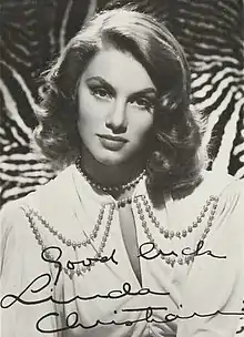 Linda Christian (born Blanca Rosa Henrietta Stella Welter Vorhauer; November 13, 1923[1][2][3] – July 22, 2011[4]) was a Mexican film actress, who appeared in Mexican and Hollywood films. Her career reached its peak in the 1940s and 1950s. She played Mara in the last Johnny Weissmuller Tarzan film Tarzan and the Mermaids (1948).[5] She is also noted for being the first Bond girl, appearing in a 1954 television adaptation of the James Bond novel Casino Royale.[6] In 1963 she starred as Eva Ashley in an episode of The Alfred Hitchcock Hour titled "An Out for Oscar".
