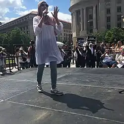 In September 2018, Sarsour announced that she would lead the 2019 Women's March on Washington along with Tamika Mallory, Bob Bland, and Carmen Perez.[39] Later that year, Sarsour and Mallory became the focus of a controversy over their perceived refusal to clearly condemn Nation of Islam leader Louis Farrakhan, whose rhetoric has been deemed antisemitic and homophobic by the Southern Poverty Law Center and the Anti-Defamation League.[40] In November 2018, Teresa Shook, the march's founder, called for Sarsour and her fellow co-chairs to step down, accusing them of having "allowed anti-Semitism, anti-LBGTQIA sentiment and hateful, racist rhetoric to become a part of the platform by their refusal to separate themselves from groups that espouse these racist, hateful beliefs."[41] Sarsour refused, suggesting the criticism of her was due to her support for BDS and that criticism of Mallory was due to racism. She later apologized to supporters of the march, expressing regret that she and Mallory did not "make their commitment to combating antisemitism clear." She also apologized to the March's LGBTQ and Jewish members, saying that she valued them and would "fight" for them.[42][43] Sarsour stepped down from the Women's March organization in September 2019 along with Bob Bland and Tamika Mallory.[2]