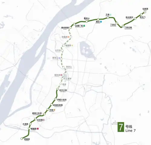 Line 7 of Nanjing Metro is a northeast–southwest line running roughly parallel to the south bank of the Yangtze River. The line began operation on 28 December 2022.[1] This line is also the first metro line to use GoA4 automated trains in Nanjing.[2]