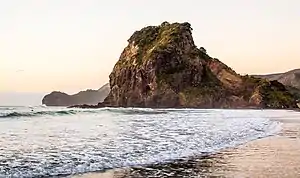 The traditional name for the rock is Te Piha, and is a name that was applied to the wider area.[5] The name Te Piha came from the pattern made when waves hit against the rock.[6] Lion Rock is in the rohe of Te Kawerau ā Maki, and was the location of island pā known as Whakaari,[7] which literally means "exposed to view" or "display".[8] The pā was captured by a Ngāti Whātua war party led by Tainui warrior Kāwharu around the year 1700.[7]
