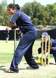 After both Australian openers fell for ducks, Sthalekar joined Karen Rolton at the crease with the score on 2/7 in the second innings. She made 40 from 122 balls and put on a stand of 115 with Rolton before being removed by Katherine Brunt, starting a steady flow of wickets as Australia were all out for 223 to leave the hosts a target of 306.[13] Sthalekar took 3/44 from 30 overs, including 16 maidens, removing captain Connor, Jenny Gunn and Beth Morgan as the hosts hung on for a draw with three wickets in hand.[8][13] In the Second Test at New Road, Worcester, Sthalekar made 34 and took 1/29, removing Brunt as the hosts made 289 and took a 158-run lead. In the second innings, she fell for a duck in Australia's 232, which left England a target of 75. Sthalekar took 0/4 as the hosts reached the target with six wickets in hand.[14] She ended the Tests with 77 runs at 19.25 and seven wickets at 21.00.[8]