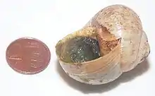 Escargot cooked with garlic and parsley butter in a shell (with a €0.02 coin as scale)