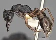 Myrmecia brevinoda Forel[14] 1910 M. brevinoda is a giant Myrmecia species that is known from New South Wales, Queensland and Victoria. It is also the only known species that was introduced outside its natural geographical range, with colonies found in New Zealand.[lower-alpha 1] M. brevinoda may exhibit polymorphism among workers; workers of this species are among the largest ants in the world, measuring 13 to 37 millimetres (0.51 to 1.46 in). The queens measure 27 to 31 millimetres (1.06 to 1.22 in) and males are 20 to 22 millimetres (0.79 to 0.87 in) long. The ant is yellowish red, with the antennae, legs and mandibles lighter yellowish. The gaster is black. It resembles M. forficata in size and colour, but the two species can be distinguished by the form of the node.[16][17]