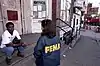 A Federal Emergency Management Agency (FEMA) worker with a flood victim from Floyd in Philadelphia