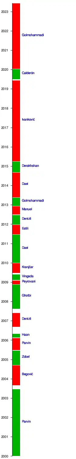 | (13) | Hamid Derakhshan [A] | 10 September 2014 | 5 April 2015 | 207 days | |||
