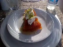 Tel kadayif dough filled with a layer of cheese and soaked in sharbat syrup. | |