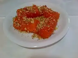 Fruit | Candied pumpkin garnished with walnuts and fresh kaymak cream (sometimes) (also sometimes topped with tahin). |