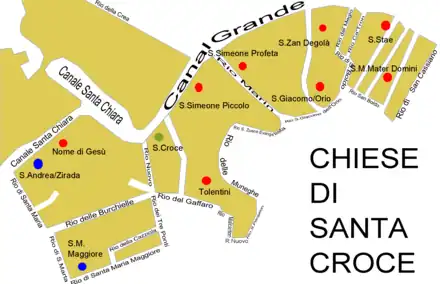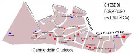 This is a complete list of churches in Venice classified by "sestiere" in which the city is divided. These are Cannaregio, San Polo, Dorsoduro (including the Giudecca and Isola Sacca Fisola), Santa Croce, San Marco (including San Giorgio Maggiore) and Castello (including San Pietro di Castello and Sant'Elena). It also details the churches on the islands outside Venice.