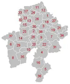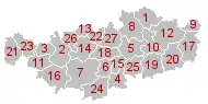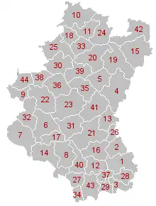 Wallonia is a region located in southern Belgium, and divided into 262 municipalities, listed in the table below. The numbers refer to the location of the municipalities on the maps of the respective provinces.