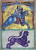 Alfonso IX of León: The lion had long been a canting representation of the kingdom of Leon, and its use as an emblem by King Alfonso VII (1126-1157) was reported in the contemporary Chronica Adefonsi imperatoris,[5] though the details of this lion are not provided. An illustration of Ferdinand II of Leon in the "Tumbo A" manuscript, a cartulary of Santiago de Compostela Cathedral, thought to have been drawn during his life, shows the monarch carrying a shield bearing an uncolored lion, while underneath the king a purple lion is shown, together apparently representing proto-heraldic use of a lion emblem. Later in the same manuscript in an illustration dated between 1208 and 1216, Alfonso IX is depicted with a true heraldic device, a shield with purple lion on a silver background that would be used by his son Ferdinand III as personal arms before being quartered with those of the Kingdom of Castile to represent the union of the two kingdoms.[23] |