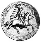 In some cases, the adoption of a symbol on a coat of arms was the culmination of a gradual progression, whereby a family can be seen using a symbol in a quasi-heraldic manner prior to its adoption as part of a formal coat. An example of this are the Counts of Saint-Pol, who between 1083 and 1130 decorated their coins with wheat sheafs that are then found on the equestrian seal of Count Engueraud (1141–50) placed in the blank space surrounding the mounted knight, before appearing on the shield of count Anselm and his successors from 1162. Similarly, the fleur-de-lis progressed from use as a decorative emblem by Henry I of France (1031–60) to then be displayed as a quasi-heraldic symbol by Louis VI, Louis VII, and Philip II (1180-1223) before becoming the charge of the French royal arms under the last of these kings.[4] Lions were used as heraldic emblems by Henry "the Lion" (before 1146), and Alfonso VII of León (d. 1157),[5] and probably by Henry I of England (d. 1135),[6] in the first half of the 12th century, and lions later appear on the coats of arms of their respective realms.