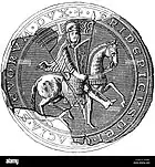 The oldest surviving heraldic seals are the equestrian seals (German: Reitersiegel) used by high nobility in the second half of the 12th century. Among the oldest examples from the Holy Roman Empire, of what would develop into German heraldry, is the lion (or "leopard") of the Staufer coat of arms, first used before 1146 by Henry "the Lion", and in 1181 on the seal of Frederick VI of Swabia.[7] Similar seals are known from England, one of the oldest being the equestrian seal of King Richard Lionheart of the House of Plantagenet, dated 1189, showing a heraldic lion design on the king's shield. His second seal, dated 1198, shows the three lions design which would subsequently become the royal coat of arms of England.