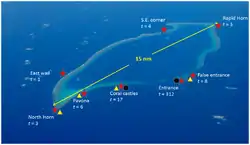 Ryukyu Islands 25°00′00″N 125°16′00″E / 25.0°N 125.266667°E / 25.0; 125.266667 Reef grouop composed of about 300 kinds of corals.