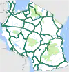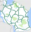The following is a list of national roads in Tanzania, under the jurisdiction of the Tanzania National Roads Agency (TANROADS). The list is not exhaustive. As part of the 2007 Roads Act in Tanzania, National roads were classified into two categories, Trunk Roads and Regional Roads. The total road network in Tanzania as of December 2022 is 181,190 km (112,590 mi), of which 36,760 km (22,840 mi) are classified as National Roads (Trunk &; Regional) and 144,429 km (89,744 mi) as District Roads (Collector, Feeder and Urban roads). District roads are under the responsibility of the President’s Office Regional Administration and Local Government (PORALG) through Tanzania Rural and Urban Roads Agency (TARURA).[1][2] Before 1980, Tanzania shared the same highway numbering system as Kenya, following the dissolution of the East African Community, the country renamed its roads to the A and B numbering system still available on some out dated maps.[3]