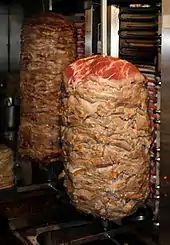 • Doner kebab – seasoned meat stacked in the shape of an inverted cone is turned slowly on a rotisserie, next to a vertical cooking element. The outer layer is sliced into thin shavings as it cooks.