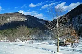 The Allegheny Plateau has a continental climate, with occasional severe low temperatures in winter and average daily temperature ranges (difference between the daily high and low) of 20 °F (11 °C) in winter and 26 °F (14 °C) in summer.[29] The mean annual precipitation for the Pine Creek watershed is 36 to 42 inches (914 to 1,070 mm).[22] January is the coldest month at Little Pine State Park, July the warmest, and June the wettest. The highest recorded temperature at the park was 104 °F (40 °C) in 1988, and the record low was −19 °F (−28 °C) in 1982.[30]